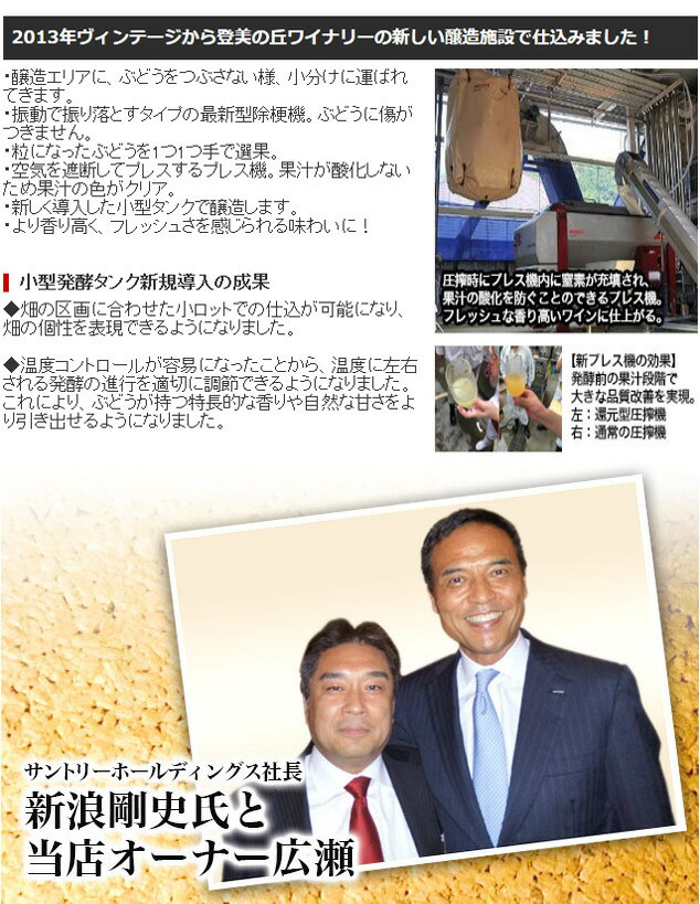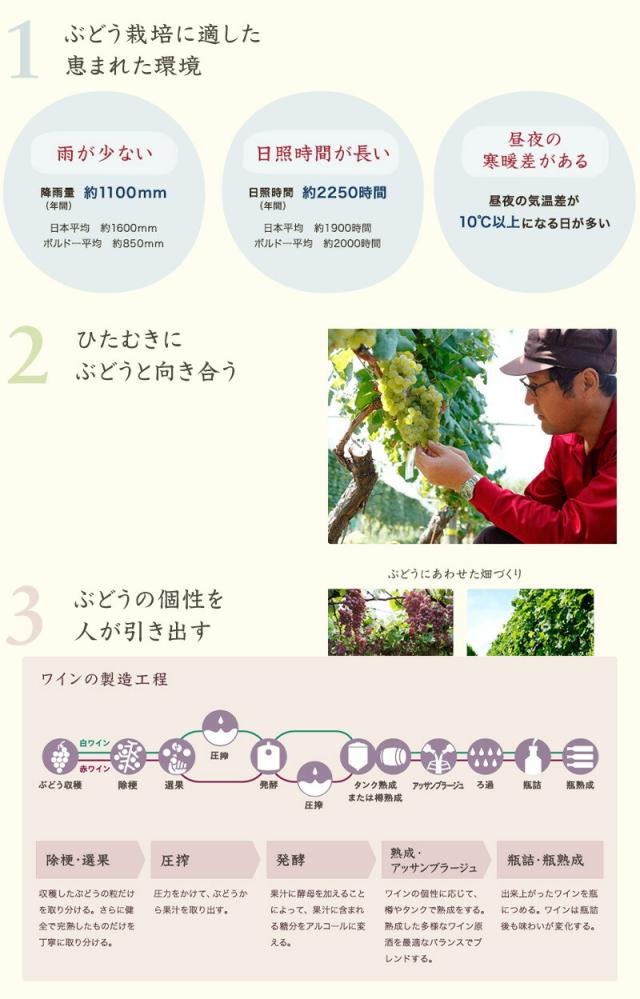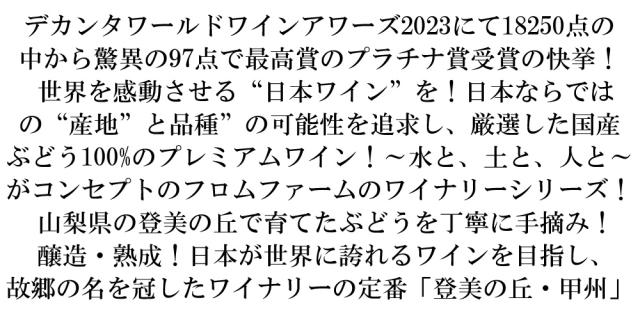 サントリー登美の丘ワイナリーは甲府の西北、山梨県甲斐市にある「登美の丘」に広大な自家葡萄園を有し、優れた醸造設備を備えた総合ワイナリー(ワイン醸造所)です。その全身となる「登美農園」の開園は1909年。以来100年にわたり「良いワインはよい葡萄から」というワインづくりの鉄則を守って、自らの手により土づくりから葡萄の実りを研究し、ワインの醸造・熟成にいたるすべてに地道な努力を重ねてきました。貴腐葡萄と貴腐ワインの誕生は、私どもの自家葡萄園ならではのその栽培・醸造技術の結晶であり、頂点を示すものであります。 ワイン専用葡萄は、一般に雨の少ない、日当たりのよい、一日の温度差が激しい気候を好みます。登美の丘は、葡萄王国、山梨の中でも最も雨の少ない土地に位置しており、畑が南向き斜面に広がっているため日当たりにも恵まれています。 また、標高が高いため、冷涼で収穫期の昼夜の気温差が大きく、葡萄の熟度も高まります。いわば、ワインのための理想郷なのです。 総面積150ha、9つの小さな丘が寄り添う大きな丘です。最も標高の高い見晴らし台園(600m)と麓の醸造所の間には約200mもの高低差があります。そして傾斜やカーブ、方角などによって畑の日照も異なり、バリエーションに富んだ地勢となっています。 登美の丘では、これらの微気候の差や土壌の条件を考慮して、最適の場所に最適の葡萄品種を植えつけています。 | 登美の丘・甲州2021年が世界最大級で権威あるワインコンクール デカンタワールドワインアワーズ2023にて18250点の中から驚異の97点で最高賞のプラチナ賞受賞の快挙(これは日本で唯一のプラチナ賞で全体の1%未満)!世界を感動させる“日本ワイン”を!日本ならではの“産地”と品種”の可能性を追求し、厳選した“国産ぶどう100%”のプレミアムワイン!サントリー日本ワインから新発売! 日本で栽培されている数あるぶどう品種の中でも、甲州は長い歴史を持つ日本固有品種であり、日本ワインを代表する品種! 「夏みかんやはっさくなど酸味のある和柑橘を思わせる香りに、白い花とりんごのような香りもほのかに感じられます。 パン生地のような旨味感に、透明感のある果実味とみずみずしい酸味のメリハリが感じられる、辛口で凝縮感ある白ワイン」と絶賛! |