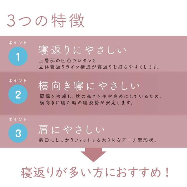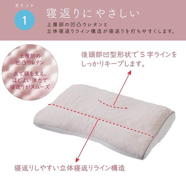 ◆詰めものの上層部には、頭部を凹凸で支えるウレタンフォームを使用。ほどよい弾力と、枕の上下を分ける立体寝返りライン構造でスムーズに寝返りが打てます。