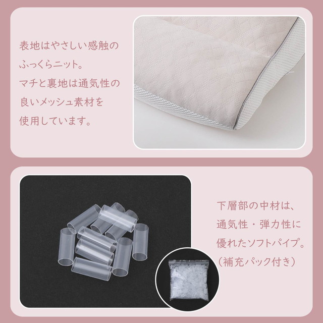 ◆通気性・弾力性のよいソフトパイプはこれまでのものに比べてサイズを少しアップ。マチ・裏地に通気性の良いメッシュ生地を使うことで、お洗濯のあとの乾燥時間が短縮!いつも気持ちよくお使いいただけます。(凹凸ウレタンシートは洗えません。お洗濯の際は取り出してください。)