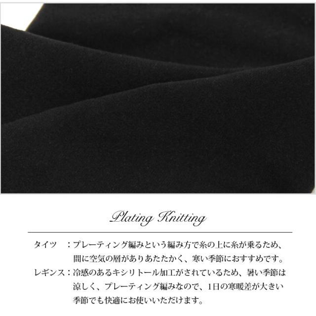 レギンス:冷感のあるキシリトール加工がされているため、暑い季節は涼しく、プレーティング編みなので、1日の寒暖差が大きい季節でも快適にお使いいただけます。