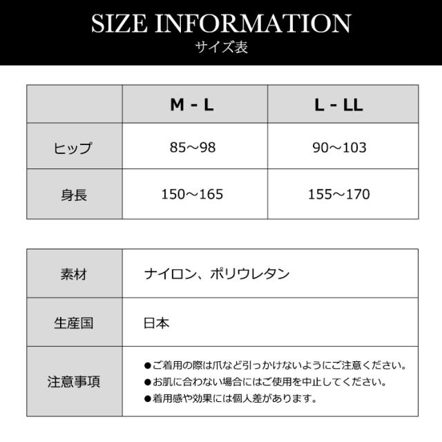 | サイズ | M-L ヒップ85〜98cm / 身長150〜165cm L-LL ヒップ90〜103cm / 身長155〜170cm |
