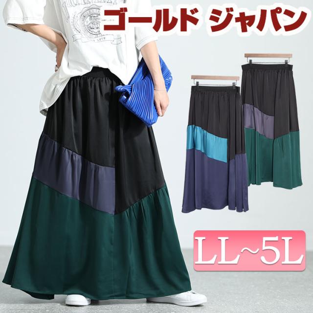 春新作 大きいサイズ レディース ボトムス スカート サテン切り替え配色スカート ロングスカート ティアードスカート ロング ティアード サテン フレア 配色 ギャザー ウエストゴム マルチカラー 変形 無地 春服 秋服 冬服 LL 2L 3L 4L 5L ブルー グレー ゴールドジャパン