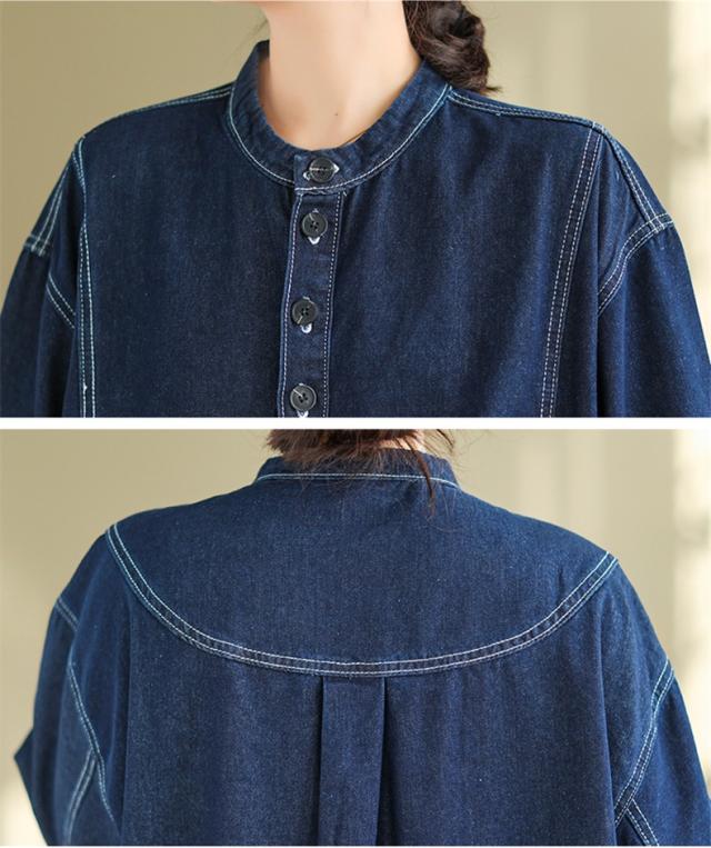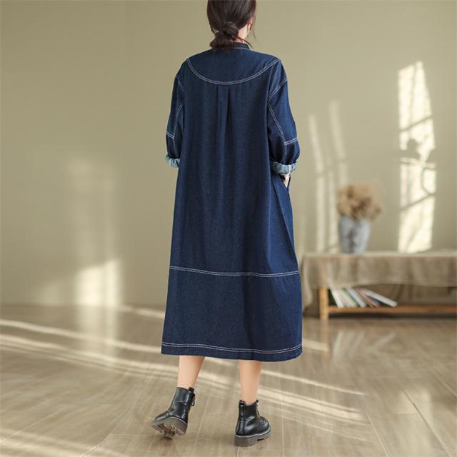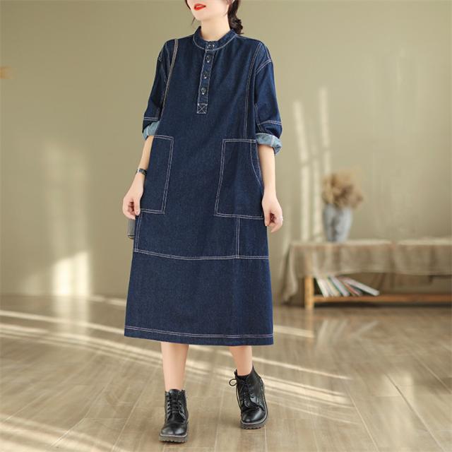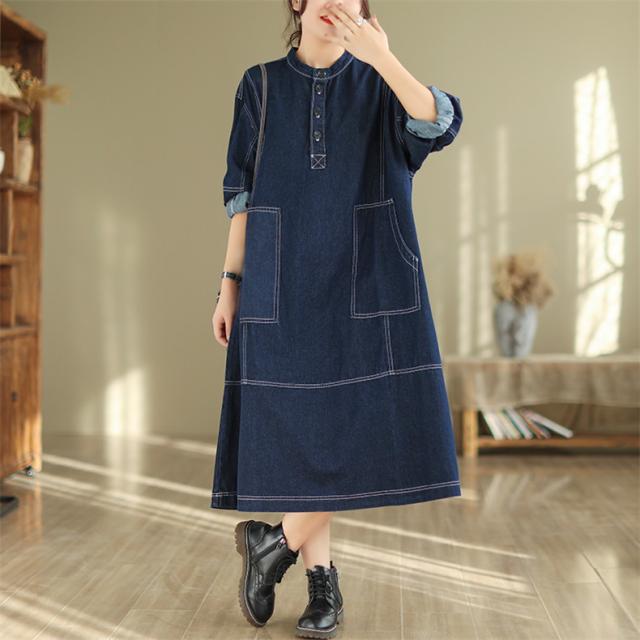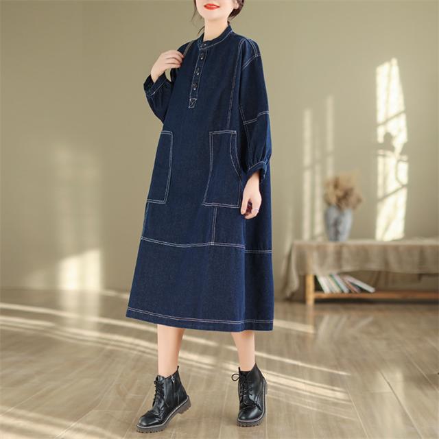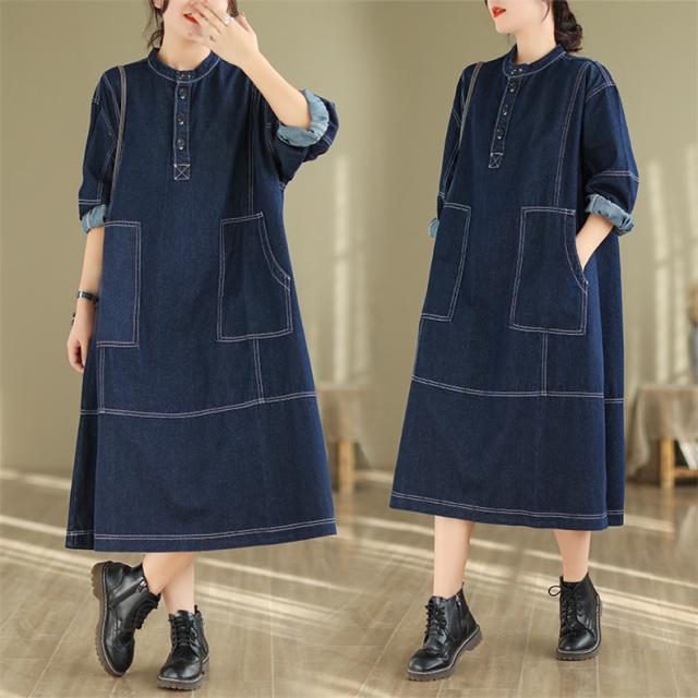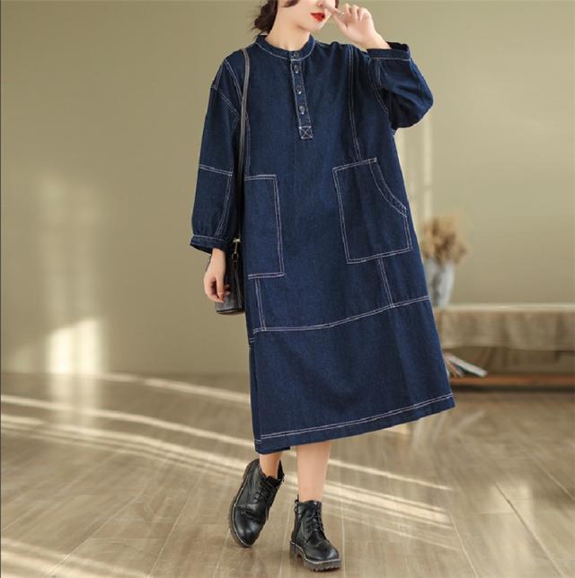 デニムワンピース ロング丈 きれいめ レディース 大きいサイズ 自然に体型カバー ゆったりシルエット ポケット付き 大人カジュアルなコーデにピッタリ