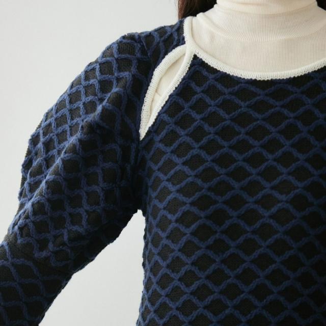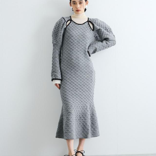クロス編みの表面感とボリュームスリーブのマーメイドニットワンピース。