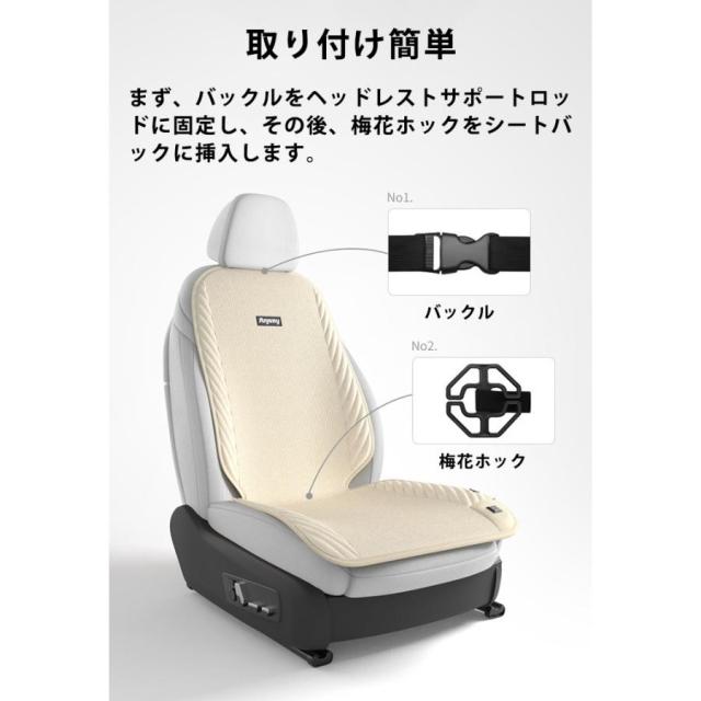 まず、バックルをヘッドレストサポートロッドに固定し、その後、梅花ホックをシートバックに挿入します。※メジャー採寸の為、サイズが多少異なる場合がございます。予めご了承ください。