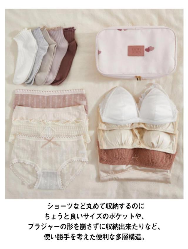 | 見た目以上の大容量!様々なシーンで活用出来るかわいい下着収納ポーチ 豊富な収納で、かさ張りがちな下着などの衣類をスッキリと整頓できちやいます! ショーツなど丸めて収納するのにちょうと良いサイズのポケットや、プラジャーの形を崩さずに収納出来たりなど、使い勝手を考えた便利な多層構造。 生地には撥水加工が施されているので、少量の水であれば撥水します。 丸洗い可能でいつでも清潔! 旅行や出張などはもちろん、修学旅行や卒業旅行、ジムや温泉など幅広いシーンで利用可能です。 かわいいデザイン、ちょっとしたプレゼントにもオススメ♪ | |