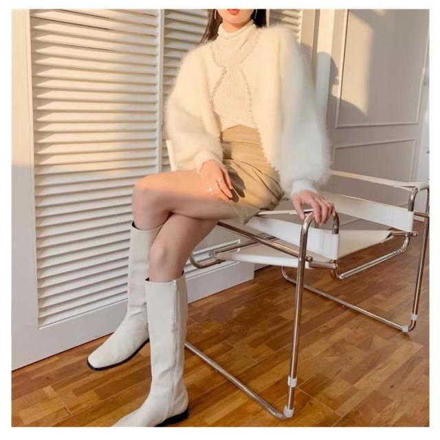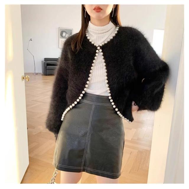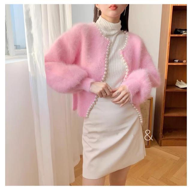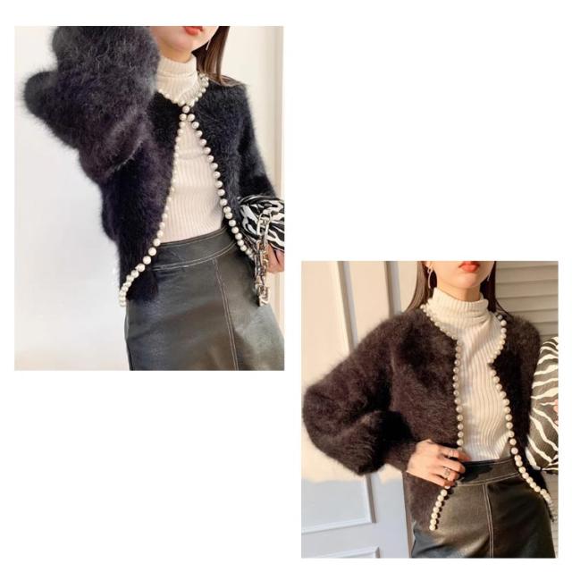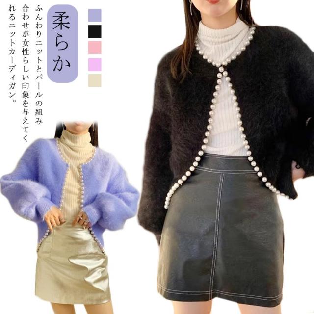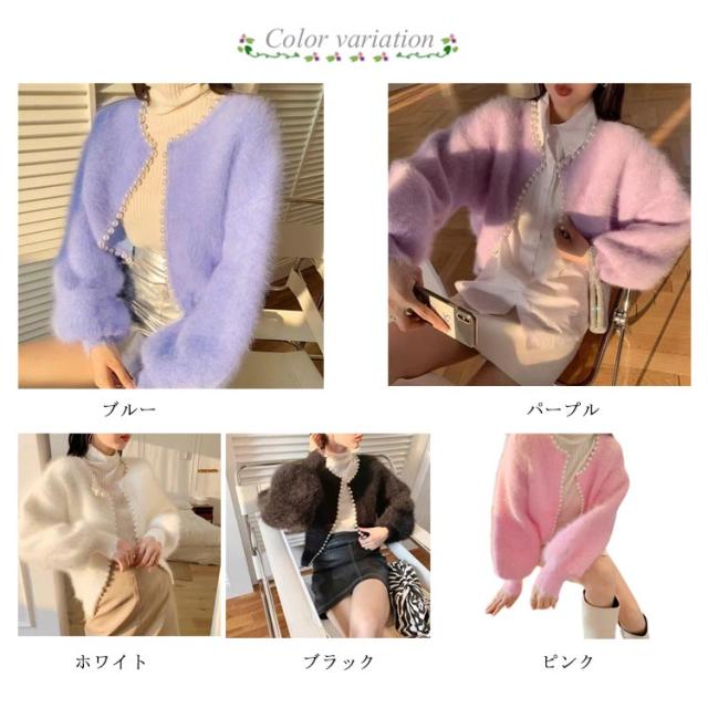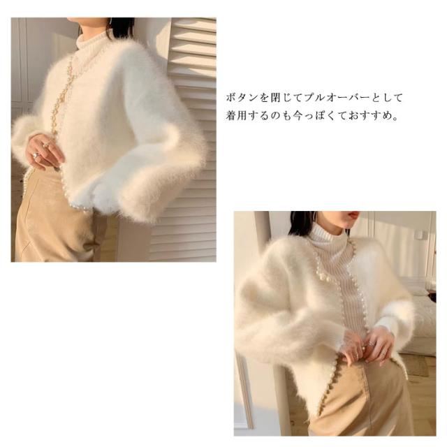 長袖 秋冬 ニット レディース パールボタン アウター バルーンスリーブ カーディガン ニットカーディガン 暖かい モコモコ 防寒 コート フワフワ ノーカラー トップス ふわふわ 羽織り パール 無地 ゆったり カジュアル きれいめ オフィス 秋 冬 ショート丈