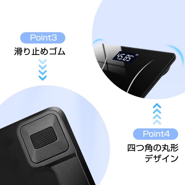 強化ガラス面が足にピッタリして、清潔しやすい体重計の底面に滑り止めゴムが設置してあるため、ストレスなく安全に使用可能です。