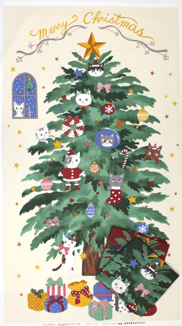 【パネル販売】 ネコ クリスマスツリー タペストリー 猫 モミの木 生地 布 シーチング 約 縦108cm 横60cm ゆうパケット4枚まで対応 ( 飾りつけ 日本製 )