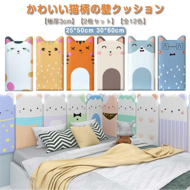 壁クッション 猫柄 30x60cm 2枚 厚さ3cm ウォールクッション ベビーガード ねこ ネコ 可愛い ケガ防止 衝撃吸収 PU革 防水 防音 テープ付き 壁マット 安全マット プレイルーム 幼稚園 保育園 壁紙 クッション シール コーナークッション 厚手 極厚