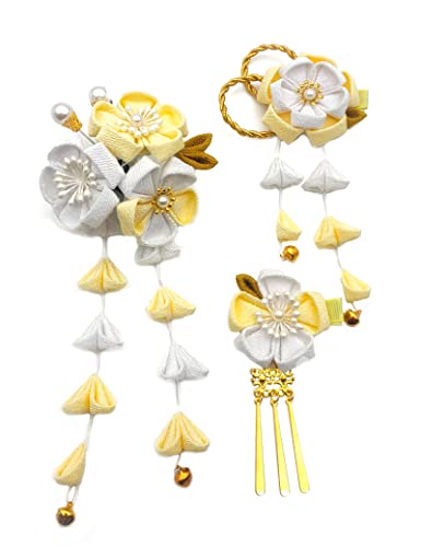 JZOON 髪飾り つまみ細工 七五三 成人式 浴衣 袴 着物 振袖 和装 花 卒業式 結婚式 鈴付き 手作り 白