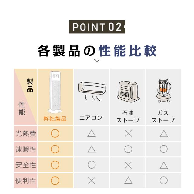 【主な特徴】主な特徴としては、燃焼系ストーブのように灯油を燃やして暖めるわけではないため空気が汚れにくい、におわない、換気しにくい場所でも使えることなどが挙げられます。ほかにも静音性、小型、軽量化、収納性が高い、空気が乾燥しにくいなどのメリットもあります。