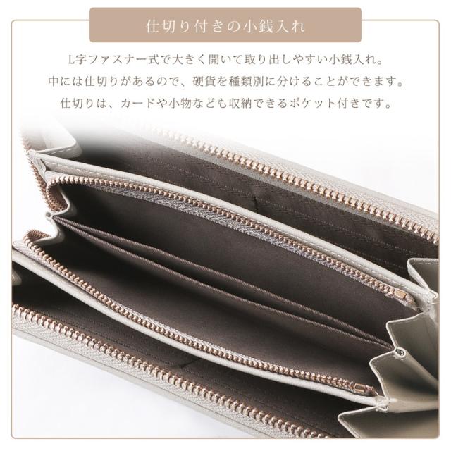 仕切り付きの小銭入れは、L字ファスナー式で大きく開いて取り出しやすくなっています。