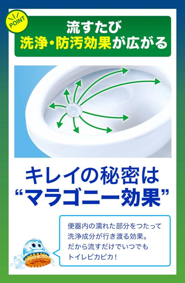 ●マラゴニー効果によって便器の内側に一箇所スタンプするだけで、トイレの水を流すたびに濃縮ジェルから洗浄・防汚成分が溶け出し全体に広がります。