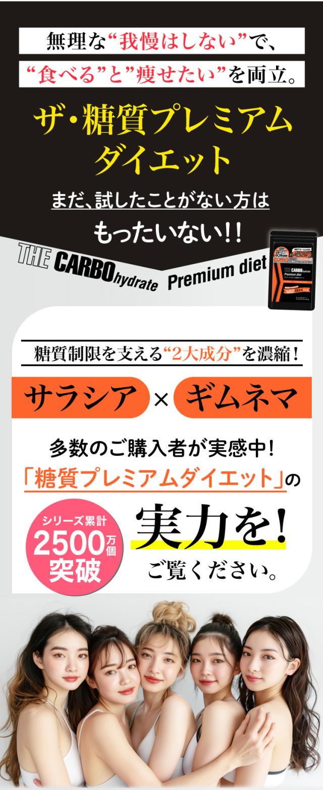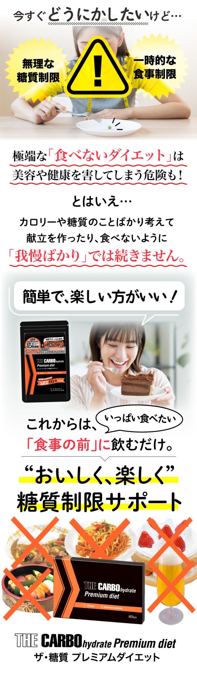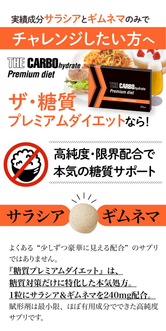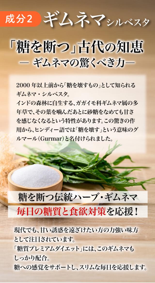 ・ザ・糖質プレミアムダイエットは、糖質を気にされる方のために「ギムネマ」と「サラシア」を高配合した、糖質サポートサプリメントです。