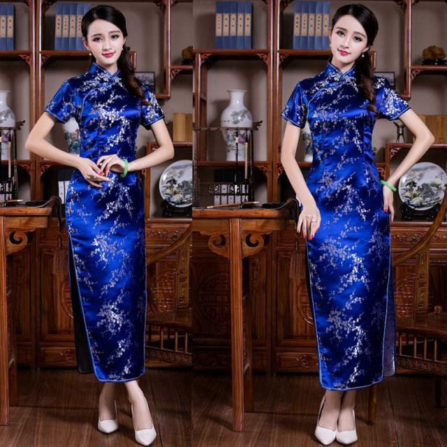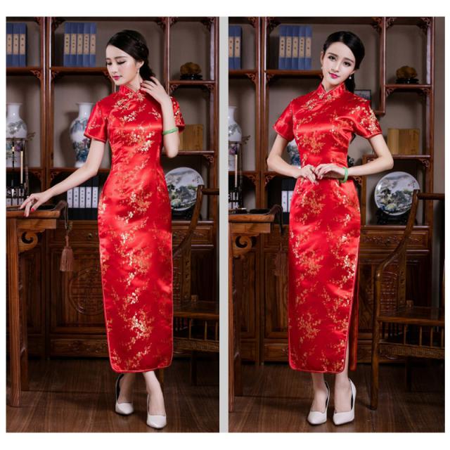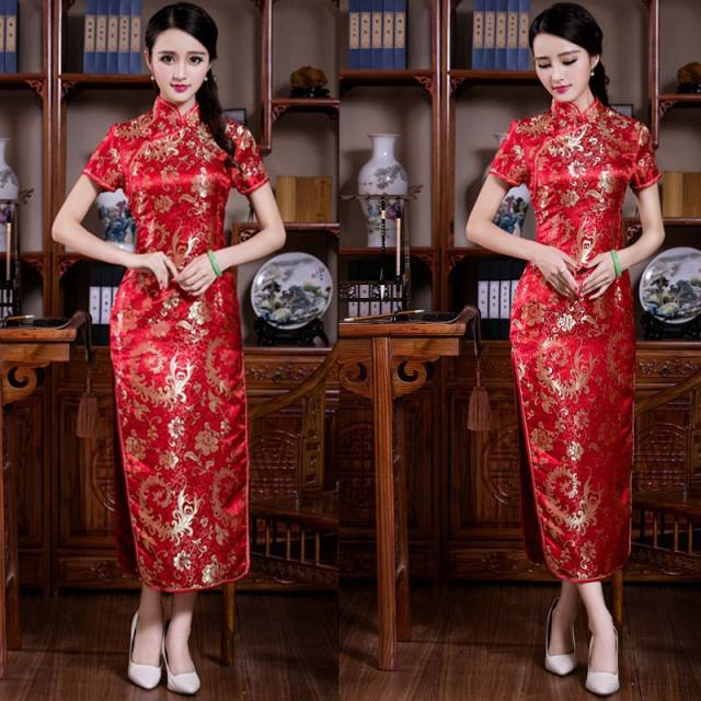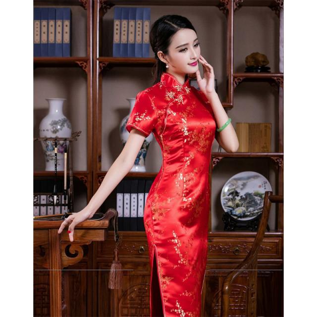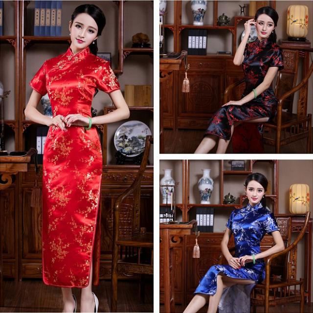 ロング丈のチャイナドレスは、全体的に優雅で上品な印象を与えます。