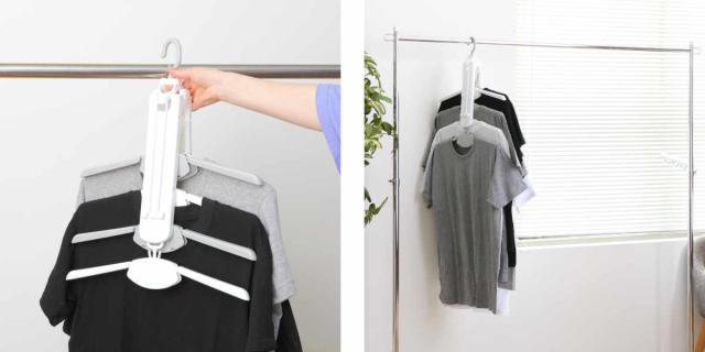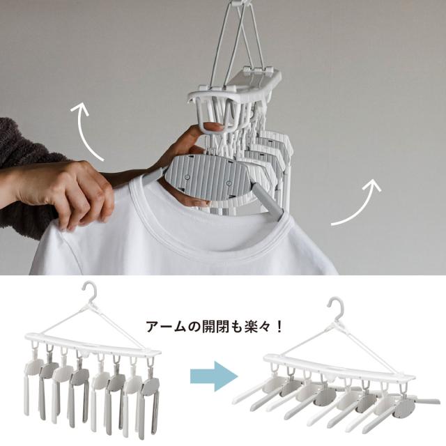首元が詰まった干しにくいTシャツなども、差し込んでアームを開けば型崩れさせずに干せます。アームの開閉も簡単で、干す時も衣服の首元を伸ばさずに干すことが出来ます。