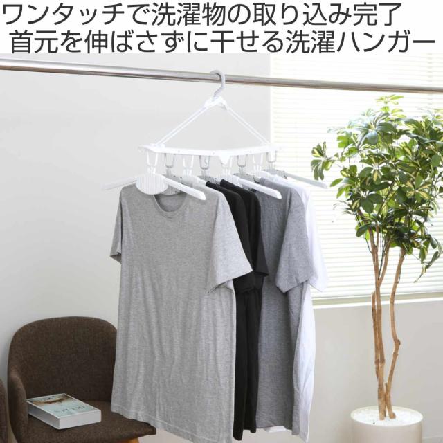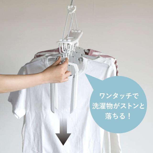 一度使うと癖になるワンタッチハンガーです。ハンガーの付け根部分をつまむだけで、サッと洗濯物が下に落ちます。洗濯カゴを下に置いて一気に洗濯物を取り込むことが出来るので、家事の時短になります。