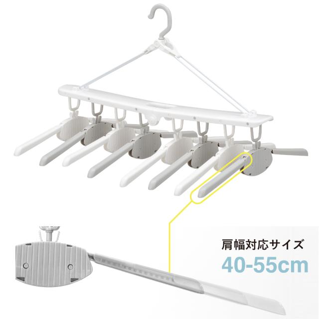 アームは引っ張るだけで40〜55cmの間で幅の調節が可能です。1本ずつ幅を変えられるので、大きめのTシャツからタイトなインナーまで、衣類の形に合わせてご使用いただけます。