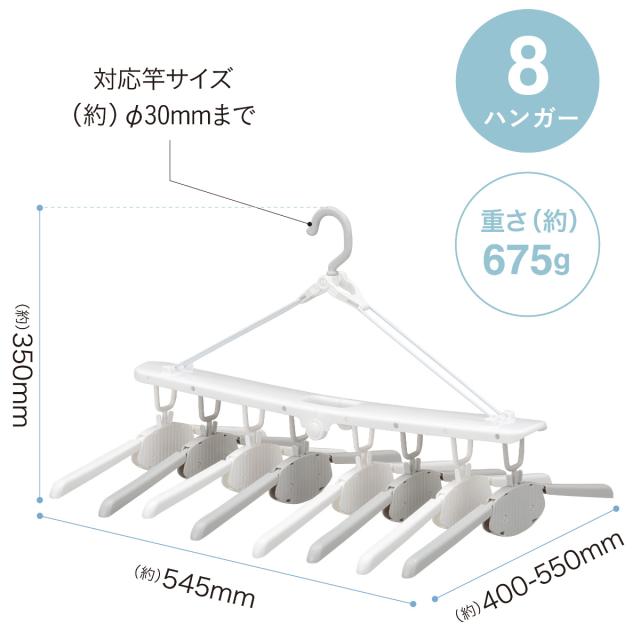 首元を伸ばさずに干せて取り込める8連ハンガー