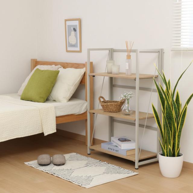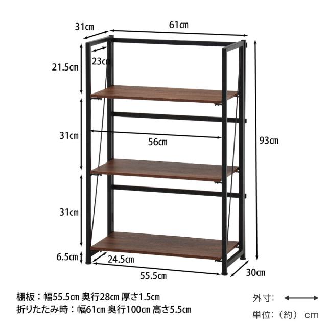 シンプルなデザインの折りたたみ式シェルフ 3段