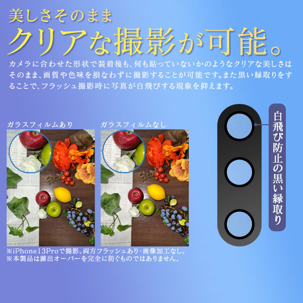 カメラレンズ全体を守る保護ガラスフィルム。レンズ周辺を覆い、カメラ全体を保護し傷がつくのを防ぎます。高い密着度によって、レンズのみのカバーに比べて防塵効果も高く、ホコリが入りにくい構造です。カメラに合わせた形状で装着後も、なにも貼っていないかのようなクリアな美しさはそのまま、画質や色味を損なわずに撮影することが可能です。また、黒い縁取りをすることでフラッシュ撮影時に写真が白飛びする現象を抑えます。フィルムは薄く、スマートフォンの縁まで適度なスペースを残すことで、ケースを付けても干渉しにくく、カメラ全体をしっかり保護します。