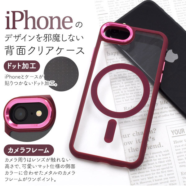 ポイントカラーがお洒落なマットバンパークリアケース。背面クリアケースなので、iPhone本体のカラーを活かすことができます。またiPhoneとケースが貼りつかないドット加工も施されています。カメラ周りはレンズが触れない高さで設計。側面に合わせたメタルカラーがワンポイントになっています。側面は柔らかいTPU素材。着脱しやすく、手に持った時も滑りにくくなっています。MagSafe対応で、内側にマグネットを内蔵することでケースを付けたままでも、ピタッと貼りつき、ワイヤレス充電など各種アクセサリーの使用が可能です。衝撃やキズなどからスマートフォンを守るのはもちろん、カメラや各種ボタンなどをケースに入れたまま操作可能です。また、落下防止に便利なストラップホール付きです。(※ストラップは付属しません)