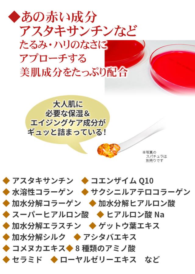 精製水、濃グリセリン、1,3−ブチレングリコール、ポリエチレングリコール・デシルテトラデセス−20・ヘキサメチレンジイソシアネート共重合体、1,2−ペンタンジオール、ヒアルロン酸ナトリウム(2)、アスタキサンチン液、リン酸L−アスコルビルマグネシウム、シクロヘキサンジカルボン酸ビスエトキシジグリコール、イソステアリン酸フィトステリル、N−ステアロイルフィトスフィンゴシン、ヒドロキシステアリルフィトスフィンゴシン、N−ステアロイルジヒドロスフィンゴシン、水素添加大豆リン脂質、ユビデカレノン、フィトステロール、トリメチルグリシン、乳酸ナトリウム液、L−ピロリドンカルボン酸、DL−ピロリドンカルボン酸ナトリウム液、DL−ピロリドンカルボン酸、L−セリン、L−アラニン、グリシン、L−グルタミン酸、塩酸リジン、L−スレオニン、L−アルギニン、L−プロリン、3−O−エチルアスコルビン酸、アシタバエキス、アセチル化ヒアルロン酸ナトリウム、加水分解シルク液、サクシニルアテロコラーゲン液、ブリエラスチン、ジグリセリン、加水分解ヒアルロン酸、コラーゲン・トリペプチド F、水溶性コラーゲン液、ローヤルゼリーエキス、ゲットウ葉エキス、コメヌカエキス、ユキノシタエキス、結晶セルロース、ポリオキシエチレン硬化ヒマシ油、ペンタステアリン酸デカグリセリル、ステアロイル乳酸ナトリウム、クエン酸、クエン酸ナトリウム、水酸化ナトリウム、ベヘニルアルコール、フェノキシエタノール、トリ(カプリル・カプリン酸)グリセリル、ノバラ油