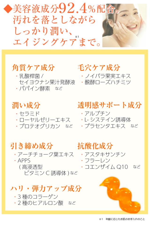 グリセリン、PEG−8、DPG、オリーブ果実油、ヤシ油脂肪酸PEG−7グリセリル、オレイン酸ポリグリセリル−10、(ベヘン酸/エイコサン二酸)ポリグリセリル−10、水、ペンチレングリコール、ヒアルロン酸Na、アスタキサンチン、ヒトオリゴペプチド−1、ユビキノン、クリサンテルムインジクムエキス、アセチルシステイン、乳酸Na、ベタイン、PCA−Na、PCA、セリン、アラニン、グリシン、グルタミン酸、リシンHCl、トレオニン、アルギニン、プロリン、フラーレン、ツバキ花エキス、セラミドEOP、セラミドNP、セラミドAP、フィトスフィンゴシン、コレステロール、3−O−エチルアスコルビン酸、アルブチン、パルミチン酸アスコルビルリン酸3Na、ノイバラ果実エキス、オウゴン根エキス、ニンジン根エキス、ビルベリー葉エキス、キュウリ果実エキス、カッパフィカスアルバレジエキス、シアノコバラミン、サクシノイルアテロコラーゲン、ゴレンシ葉エキス、ゼニアオイ花エキス、プラセンタエキス、加水分解コラーゲン、アーチチョーク葉エキス、ハマメリス葉エキス、加水分解ヒアルロン酸、乳酸桿菌/セイヨウナシ果汁発酵液、ユキノシタエキス、ライム果汁、オレンジ果汁、レモン果汁、グレープフルーツ果実エキス、サンザシエキス、ナツメ果実エキス、リンゴ果実エキス、水溶性プロテオグリカン、ジラウロイルグルタミン酸リシンNa、水溶性コラーゲン、ローヤルゼリーエキス、グルコノバクター/ハチミツ発酵液、ウメ果実エキス、カルボマー、キサンタンガム、イソステアリン酸ポリグリセリル−2、ステアリン酸グリセリル(SE)、トリ酢酸テトラステアリン酸スクロース、パパイン、エチドロン酸、水酸化K、ゴマ油、ホホバ種子油、サフラワー油、トコフェロール、リゾレシチン、水添レシチン、ラウロイルラクチレートNa、ステアリン酸ポリグリセリル−10、PVP、デキストリン、フェノキシエタノール、ダイズ油、BG、トリ(カプリル酸/カプリン酸)グリセリル、プロパンジオール、グレープフルーツ果皮油、マンダリンオレンジ果皮油、オレンジ油、グルコシルルチン
