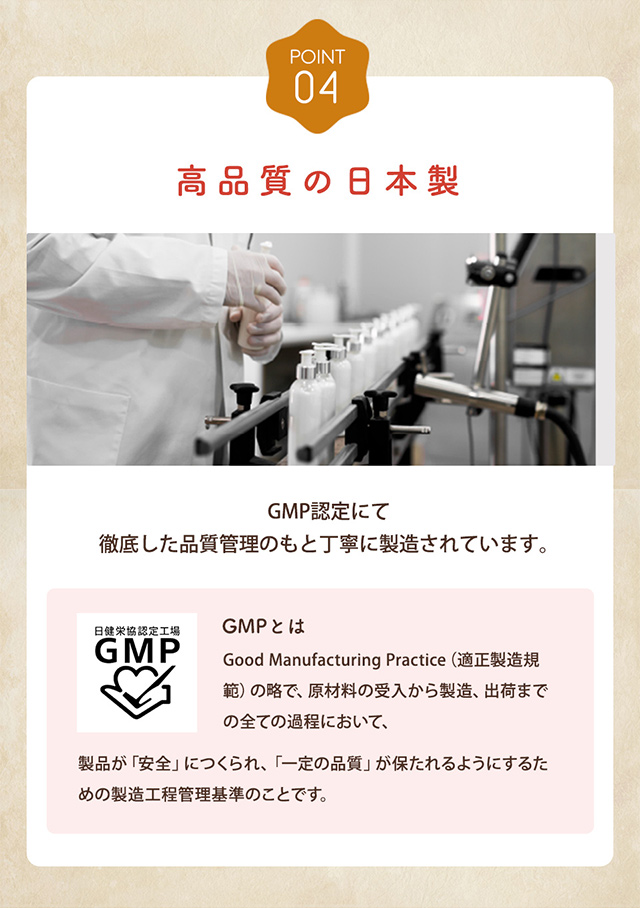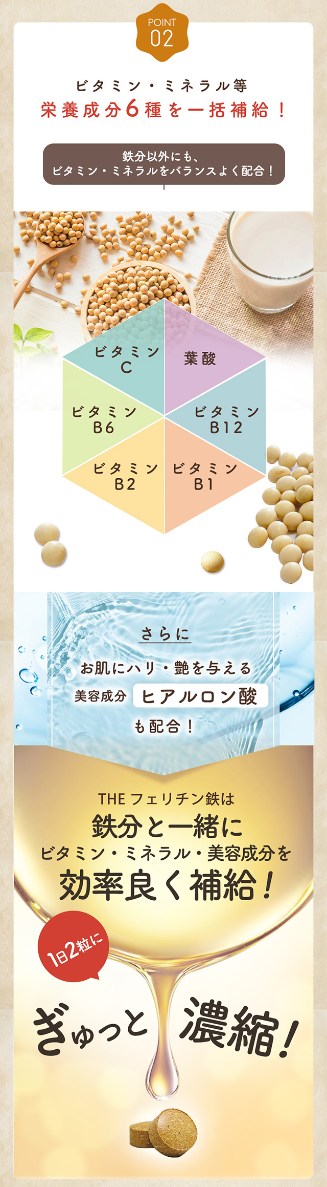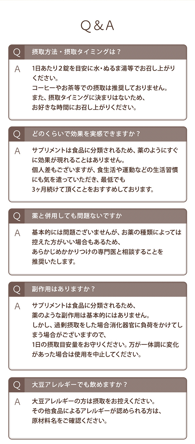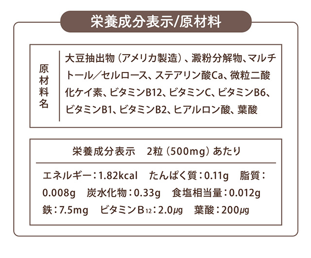 | 成分 | 大豆抽出物(アメリカ製造)、澱粉分解物、マルチトール/セルロース、ステアリン酸Ca、微粒二酸化ケイ素、ビタミンB12、ビタミンC、ビタミンB6、ビタミンB1、ビタミンB2、ヒアルロン酸、葉酸 |