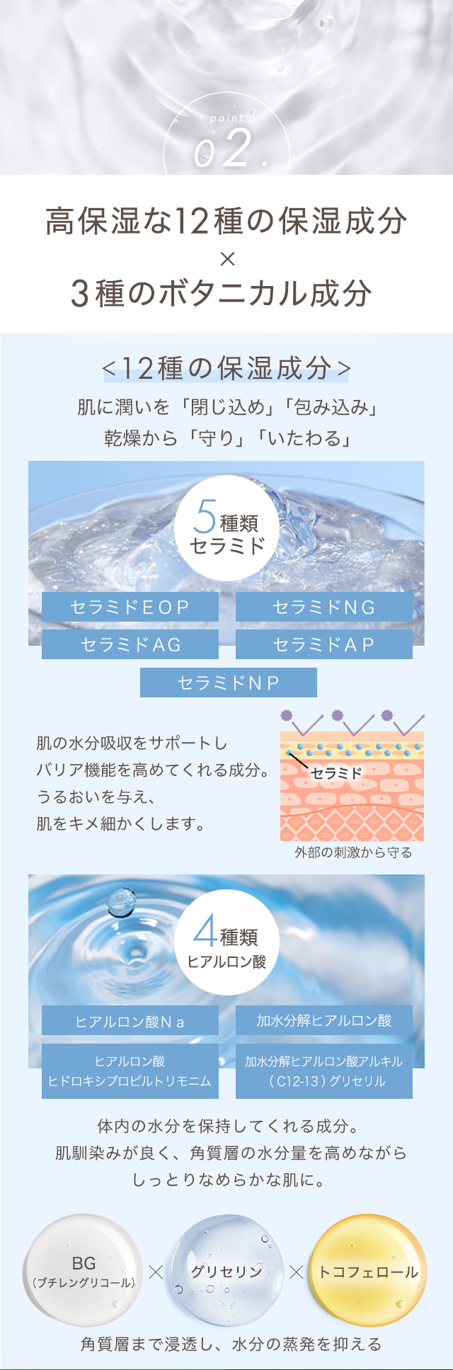 | 成分 | 水、ミネラルオイル、BG、グリセリン、セラミドNG、セラミドAP、セラミドAG、セラミドNP、セラミドEOP、ヒアルロン酸Na、加水分解ヒアルロン酸、ヒアルロン酸ヒドロキシプロピルトリモニウム、加水分解ヒアルロン酸アルキル(C12-13)グリセリル、マンダリンオレンジ果皮エキス、カミツレ花エキス、ダマスクバラ花エキス、ラウロイルグルタミン酸ジ(フィトステリル/オクチルドデシル)、トコフェロール、ワセリン、ステアリルアルコール、ステアリン酸グリセリル(SE)、ポリソルベート60、イソステアリン酸ソルビタン、水添レシチン、フィトステロールズ、カプリル酸グリセリル、キサンタンガム、(アクリル酸ヒドロキシエチル/アクリロイルジメチルタウリンNa)コポリマー、(アクリレーツ/アクリル酸アルキル(C10-30))クロスポリマー、水酸化K、香料、エチルヘキシルグリセリン、フェノキシエタノール |