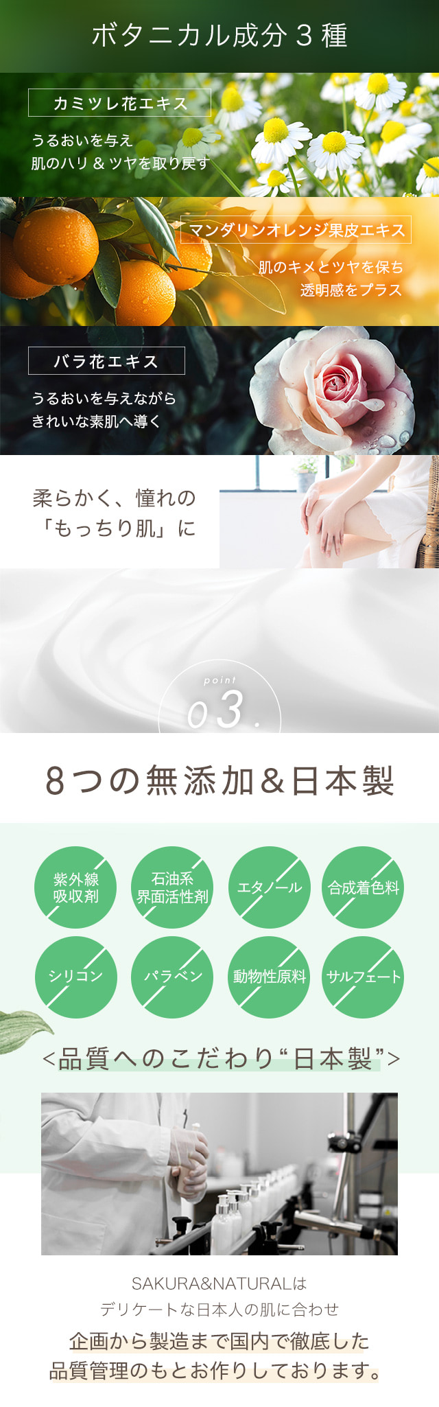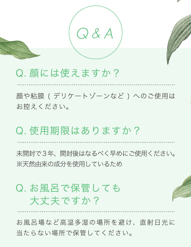 | 注意事項 | ●お肌に異常が生じていないかよく注意して使用してください。 ●傷、はれもの、湿しん等、異常のあるときは、使用しないでください。 ●使用中、又は使用後日光にあたって、赤み、はれ、かゆみ、刺激、色抜け(白斑等)や黒ずみ等の異常が現れたときは、使用を中止し、皮膚科専門医等へご相談をおすすめします。そのまま化粧品類の使用を続けますと悪化することがあります。 ●目に入らないよう注意し、入った場合はこすらずにすぐに洗い流してください。異物感が残る場合は眼科医に相談してください。 ●極端に高温又は低温の場所、直射日光のあたる場所には保管しないでください。 ●乳幼児の手の届かないところに保管してください。 ●色や香りに変化が生じる場合がありますが、ご使用には問題ありません。 |