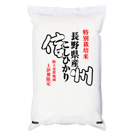 農薬を抑えた特別栽培米です。南アルプスの西麓に広がる上伊那地域(辰野町,伊那市,高遠町,長谷村,宮田村,南箕輪村,箕輪町,駒ヶ根市,飯島町,中川村)は、長野県南信地域として「特A」受賞のコシヒカリを生産する地域です。