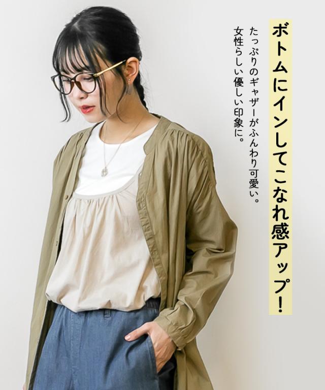 襟ぐりに入った細かなギャザーのデザインで体型をひろわないAラインに仕上がりました。