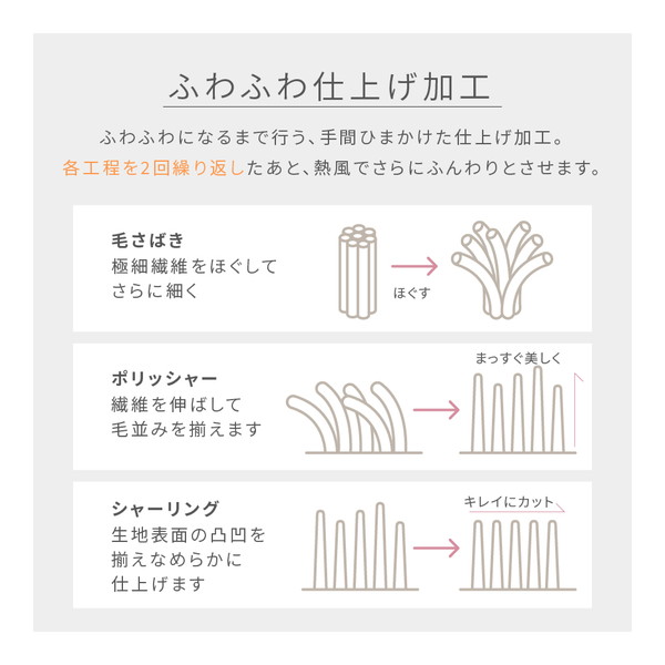 ・ご使用時の摩擦や洗濯時に毛並みが乱れた場合は、早めに一方向にブラシを掛けてください。