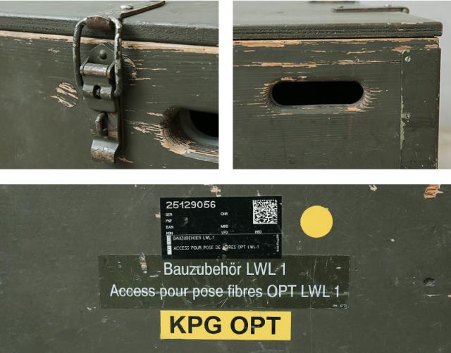 スイス軍の雰囲気抜群な木製ミリタリーボックスです。保護性の高い精密機器やケーブルなどを入れていたボックスのようで、重厚でしっかりとした分厚い木製で出来ています。中は塗装なしの木目で、大きく二部屋に分かれており、中央には小物の収納に便利な仕切りスペースが備わっています。無骨なデザインやカラーは、アウトドアやガレージの収納ボックスとしては勿論、インダストリアル・アーミースタイルなインテリアとしてやお店のディスプレイに取り入れるだけでより本格的な雰囲気を味わうことが出来ます。