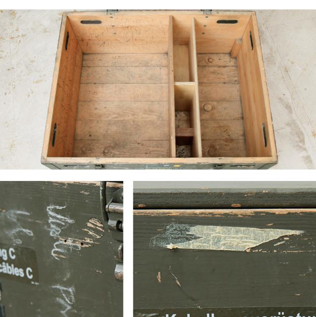 スイス軍の雰囲気抜群な木製ミリタリーボックスです。保護性の高い精密機器やケーブルなどを入れていたボックスのようで、重厚でしっかりとした分厚い木製で出来ています。中は塗装なしの木目で、大きく二部屋に分かれており、小物の収納に便利な仕切りスペースが備わっています。無骨なデザインやカラーは、アウトドアやガレージの収納ボックスとしては勿論、インダストリアル・アーミースタイルなインテリアとしてやお店のディスプレイに取り入れるだけでより本格的な雰囲気を味わうことが出来ます。