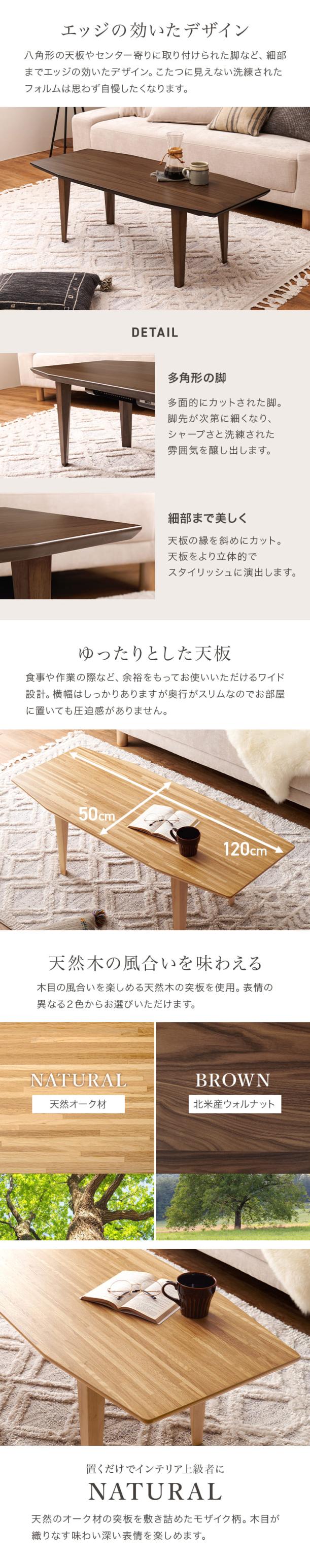 布団レス こたつテーブル 幅120×奥行50cm 舟形 八角形 ナチュラル 天然木 オーク材 オフタイマー付 ちいさめ 1人用 センターテーブル LUEL