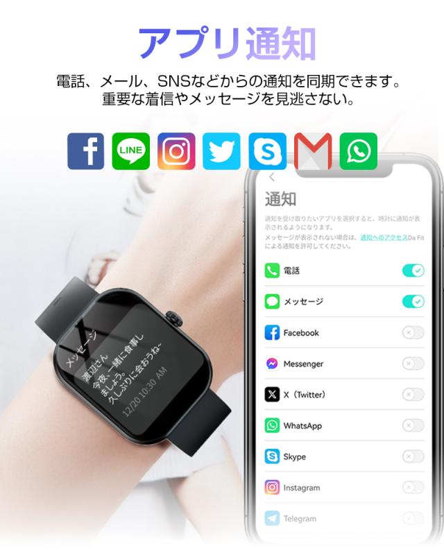 スマホを取り出さずに通話ができるスマートウォッチで、毎日の生活に大きな利便性を提供します。アプリと接続すると、ウォッチから直接電話をかけたりすることができます。さらに、LINEなどの通知も知らせるので、大切なメッセージも見逃せません。