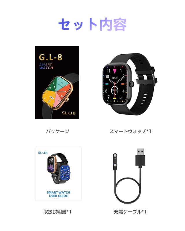 【パッケージ内容】スマートウォッチ本体、充電ケーブル、取扱説明書。