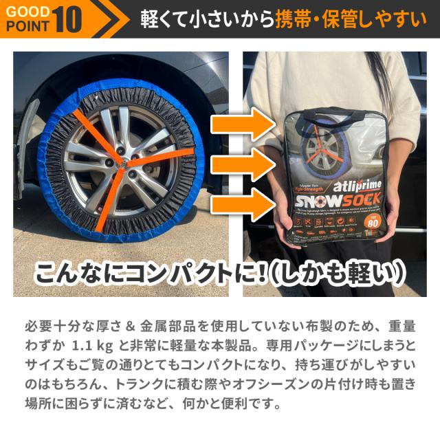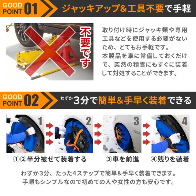 取り付け時にジャッキ類や専用工具などを使用する必要がないため、とてもお手軽です。本製品を車に常備しておくだけで、突然の積雪にもすぐに装着して対処することができます。
