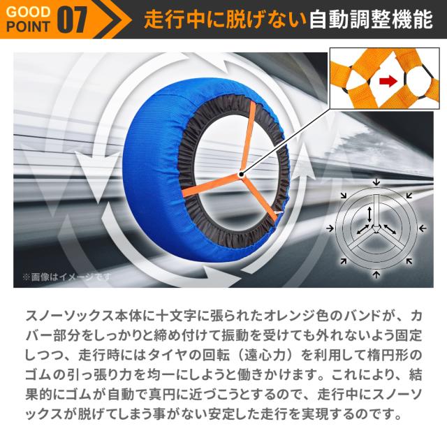 スノーソック本体に十文字に張られたオレンジ色のバンドが、カバー部分をしっかりと締め付けて振動を受けても外れないよう固定しつつ、走行時にはタイヤの回転を利用して楕円形のゴムの引っ張り力を均一にしようと働きかけます。これにより、結果的にゴムが自動で真円に近づこうとするので、走行中にスノーソックが脱げてしまう事がない安定した走行を実現します。