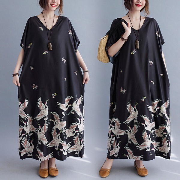 送料込 送料無料 目立ち度MAX!個性派ファッション ゆったりデザイン/セレブ系 オシャレな鶴柄デザインワンピース シャツワンピース カジュアル フォーマル ステージ衣装 発表会