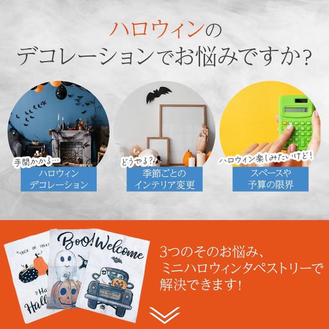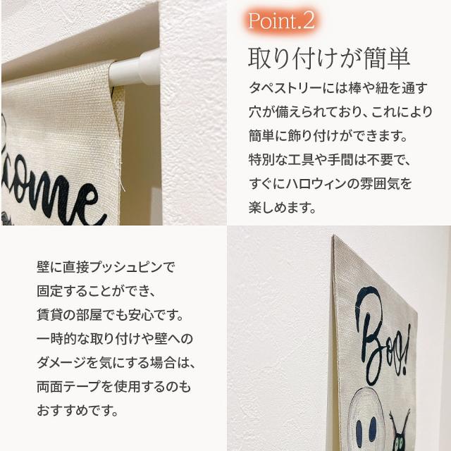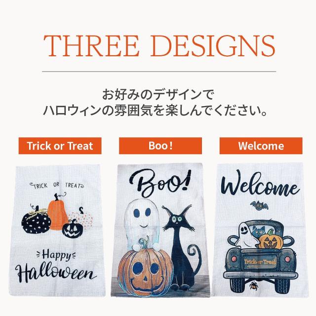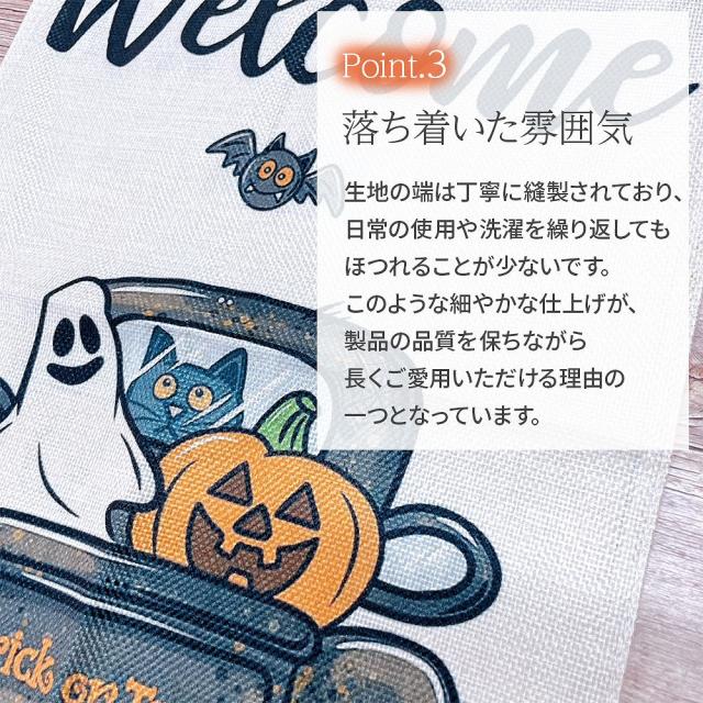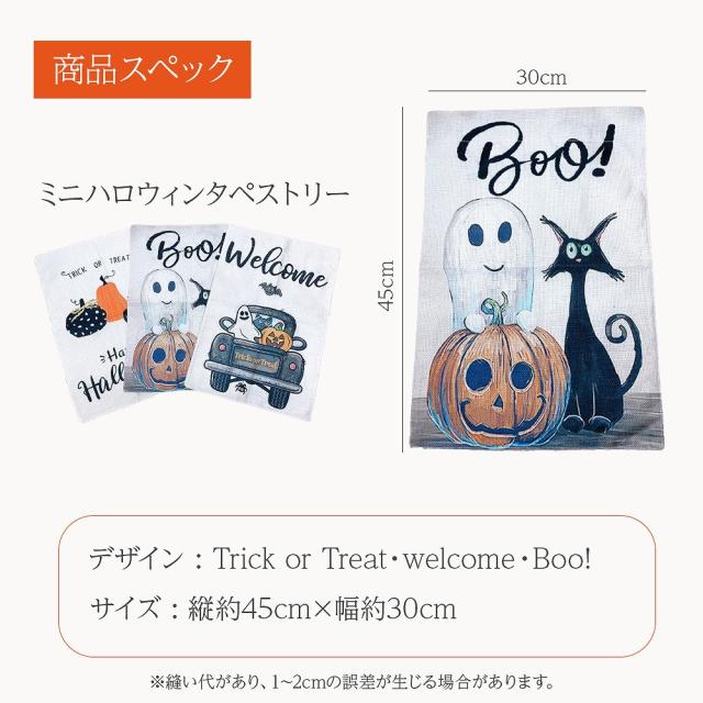 | 主な仕様 | スタイル:Trick or Treat・welcome・Boo! サイズ:縦約45cm×幅約30cm ※縫い代があり、1〜2cmの誤差が生じる場合があります。 |