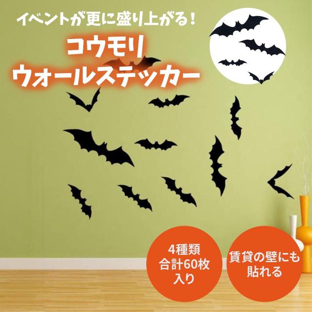 セット内容には、4種類のコウモリステッカーが60枚セットに含まれており、異なるサイズやデザインのステッカーが揃っています。これらを工夫して配置すれば、さまざまなデコレーションアイデアを実現できます。