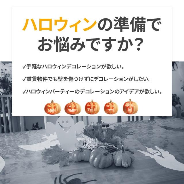 取り付けも簡単で、賃貸物件でも安心して使用できる剥がせるタイプ。お好みの場所に貼るだけで、お部屋や学園祭、パーティー会場を一瞬でハロウィンムードに変えることができます。