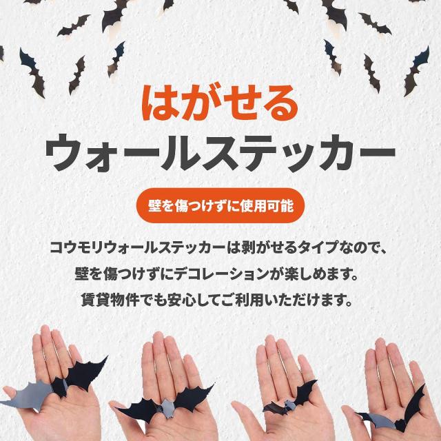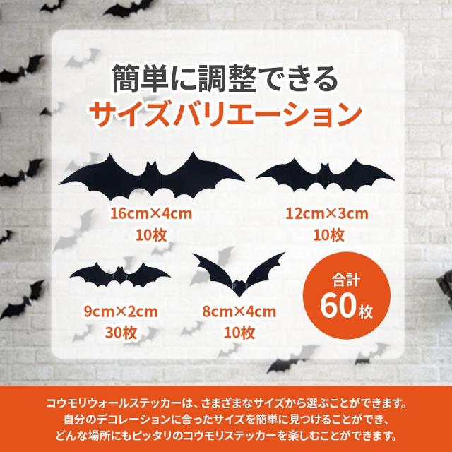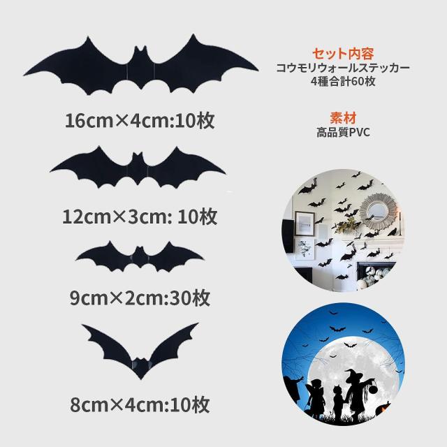 | 主な仕様 | セット内容: 4種類のコウモリステッカー60枚セット 16cm×4cmサイズ: 10枚 12cm×3cmサイズ: 10枚 9cm×2cmサイズ: 30枚 8cm×4cmサイズ: 10枚 素材: 高品質PVC |