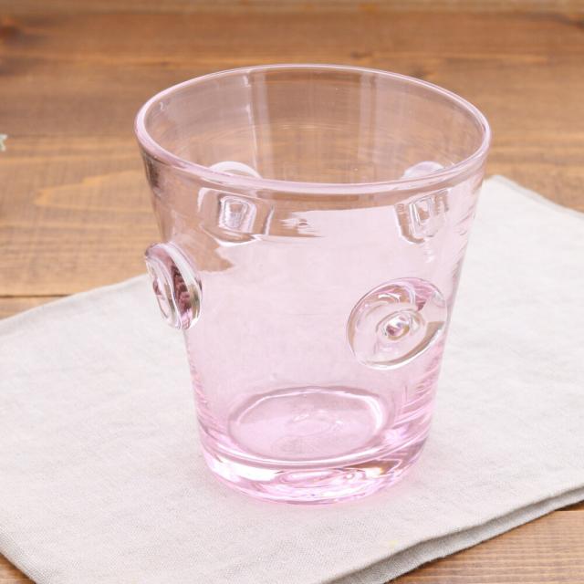 手吹きの手作り感が味わい深く、ピンク色でかわいい印象のガラス製グラスです。