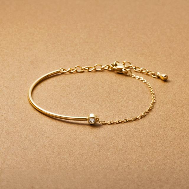 1粒ビジューがさりげない、チェーンとバングルを組み合わせたブレスレット。華奢なデザインが手元になじみ、洗練された女性らしい雰囲気を演出。錆びにくいステンレス製でデイリーに活躍する一品です。