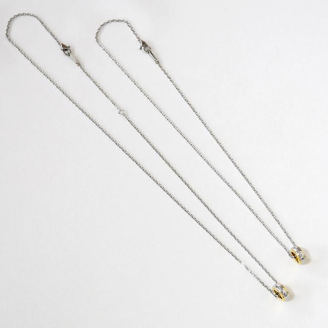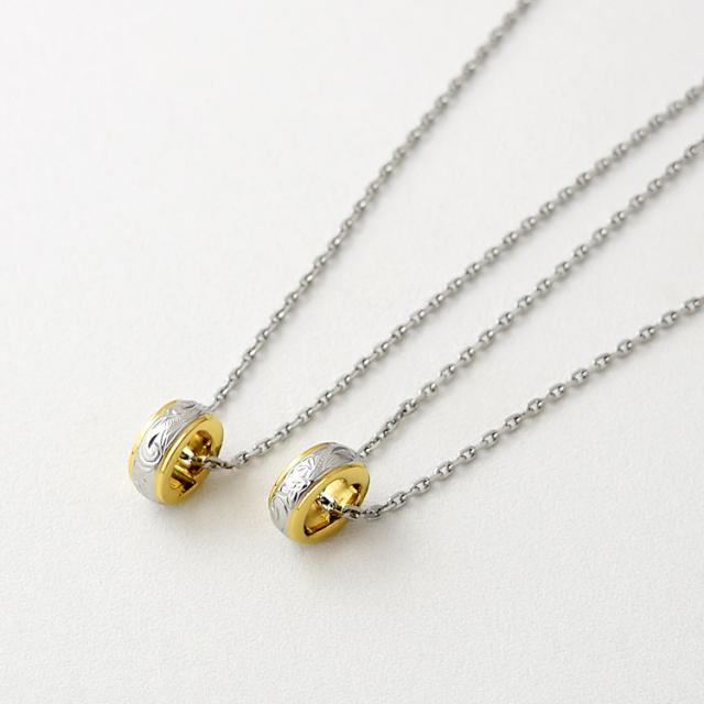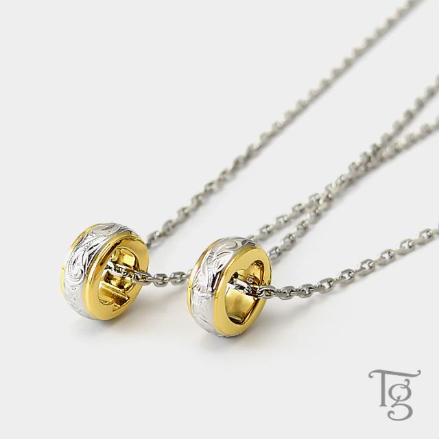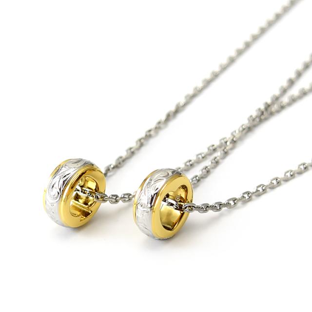 バレル(樽)モチーフに繊細なハワイアン柄をあしらった、スペードとハートの抜き型がおしゃれなペアネックレス。【イエローゴールドカラー】